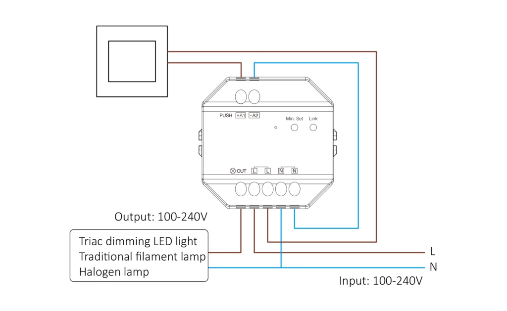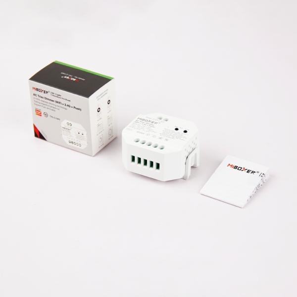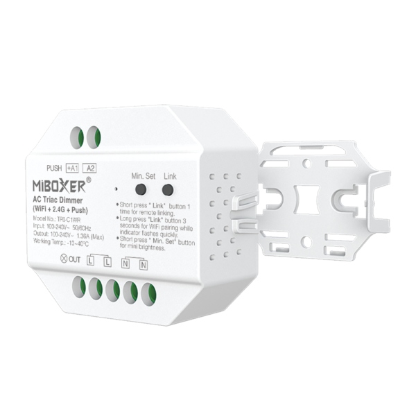 MiBoxer AC Triac Dimmer (WiFi + 2.4G + Push) ir viedais Triac dimmeris paredzēts AC apgaismojuma vadībai ar WiFi, 2.4 GHz RF tālvadību un push (fiziskā slēdža) dimēšanu. Ierīce nodrošina bezpakāpju spilgtuma regulāciju (0–100 %) bez mirgošanas, minimālā spilgtuma iestatīšanu, pārsūtīšanas funkciju signāla paplašināšanai un aizsardzību pret pārslodzi. Tas integrējas ar Tuya Smart lietotni, balss asistentu vadību (Alexa, Google Assistant u.c.) bez papildu 2.4 GHz gateway.