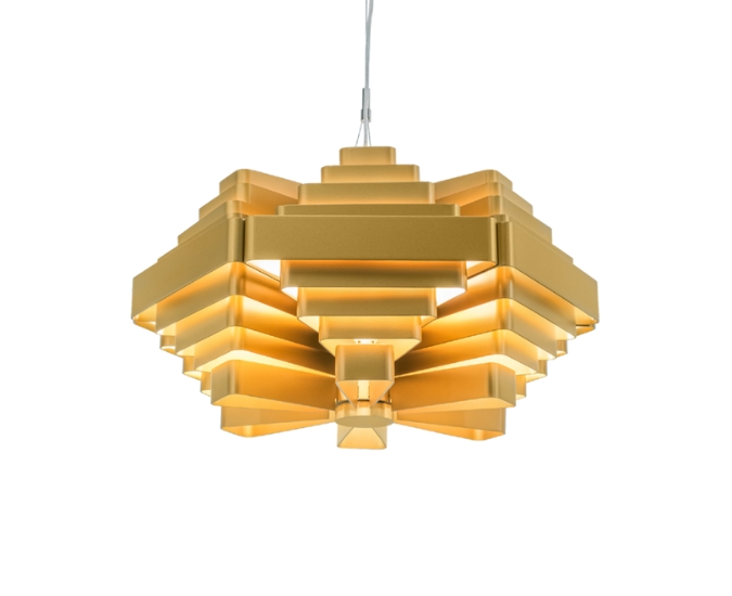 J.J.W. 042 GOLD - Iekarināms gaismeklis no Wever & Ducre. J.J.W gaismekļu sēriju ir izveidojis interjera dizainers un arhitekts Jules Wabbes 1960'ajos gados. Forma ir vienkārša, bet tajā pat laikā sarežģīta - daudzu pakāpienu, plānu alumīnija lokšņu skulptūra, kuras centrs ir platāks, bet pakāpeniski tās sašaurinās, radot blīvu kompleksu kupolu gaismas spēlei caur lokšņu starpām, kā arī izgaismojot virsmu uz augšu un uz leju.