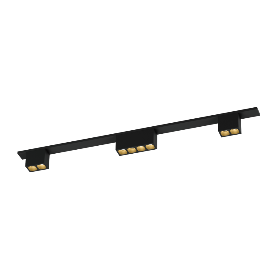 PIRRO ON BASE 2.4.2 BLACK MATT + GOLD ir griestu spot sistēma no Wever & Ducre ar trim vairāku punktu horizontāli grozāmiem gaismas avotiem.